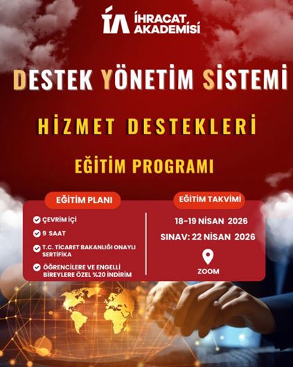 18-22 Nisan 2026 tarihleri arasında Ticaret Bakanlığı tarafından İhracat Akademisi bünyesinde, Destek Yönetim Sistemi (DYS) - Hizmet Destekleri Eğitim Programı'nın çevrim içi gerçekleştirileceği belirtilmiştir. Yazıda, programa kayıtların İhracat Akademisi resmi internet sitesi (https://ihracatakademisi.org.tr/) üzerinden alınmaya başlandığı ve programa ilişkin ücret bilgisi ile diğer ayrın ...