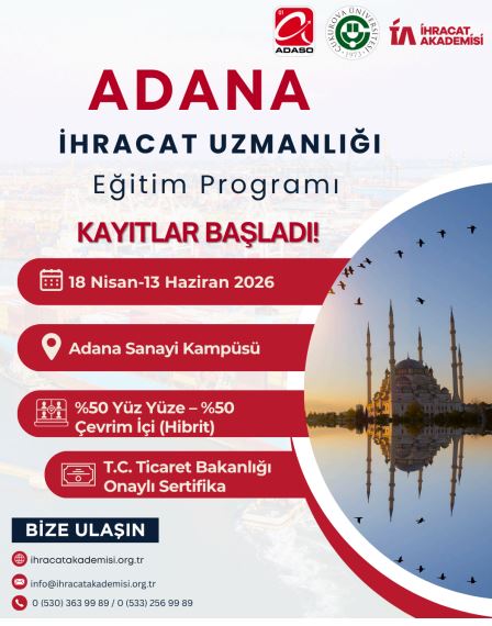 8 Nisan 2026–13 Haziran 2026 tarihleri arasında Ticaret Bakanlığı tarafından İhracat Akademisi bünyesinde, Adana İhracat Uzmanlığı Eğitim Programı'nın çevrim içi ve yüz yüze formatta gerçekleştirileceği belirtilmiştir. Yazıda, programa kayıtların İhracat Akademisi resmi internet sitesi (https://ihracatakademisi.org.tr/) üzerinden alınmaya başlandığı ve programa ilişkin ücret bilgisi i ...