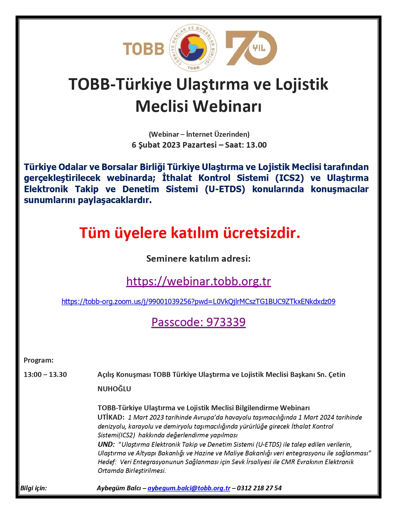 Türkiye Odalar ve Borsalar Birliği Türkiye Ulaştırma ve Lojistik Meclisi tarafından gerçekleştirilecek webinarda; İthalat Kontrol Sistemi (ICS2) ve Ulaştırma Elektronik Takip ve Denetim Sistemi (U-ETDS) konularında konuşmacılar sunumlarını paylaşacaklardır. Tüm üyelere katılım ücretsizdir. Seminere katılım adresi: https://webinar.tobb.org.tr https://tobb-org.zoom.us ...