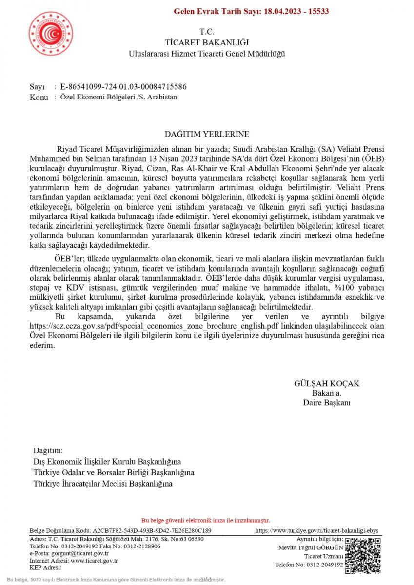 Suudi Arabistan Özel Ekonomi BölgelerSuudi Arabistan Krallığı Veliaht Prensi Muhammed bin Selman tarafından Suudi Arabistan'da dört Özel Ekonomi Bölgesi'nin kurulacağı duyurulmuştur. Riyad, Cizan, Ras Al-Khair ve Kral Abdullah Ekonomi Şehri'nde yer alacak ekonomi bölgelerinin amacının, küresel boyutta yatırımcılara rekabetçi koşullar sağlanarak hem yerli yatırımların hem de doğrudan yabancı yatırımların artırılması olduğu belirtilmiştir. Ekte özet bilgilerine yer verilen konu hakkında ayrıntılı bilgiye https://sez.ecza.gov.sa/pdf/special_economics_zone_brochure_english.pdf linkinden ulaşılması mümkündür. Bilgilerinizi ve konunun ilgili üyelerinize duyurulması hususunda gereğini rica ederim.